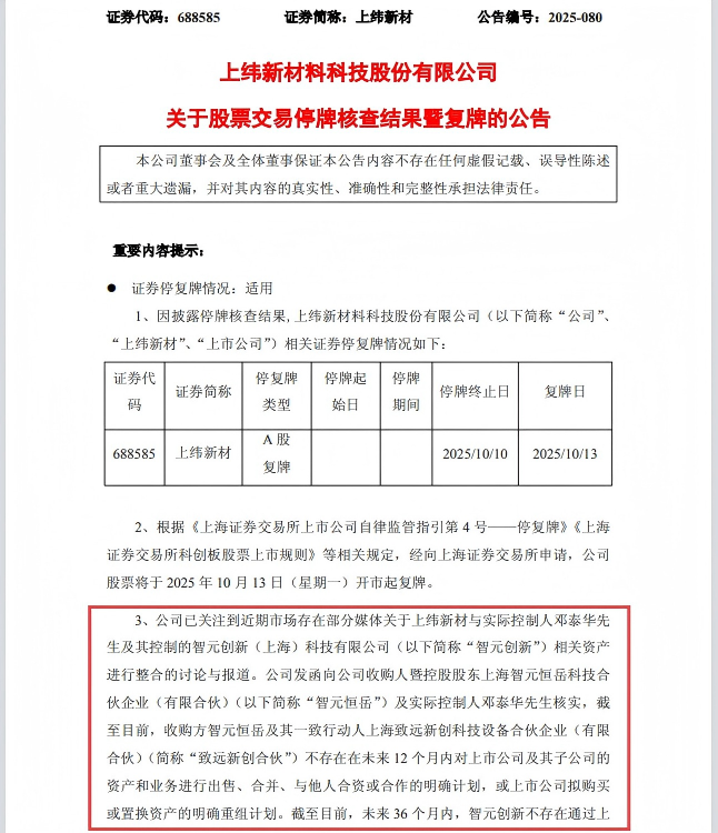 10月10日晚间,上纬新材公告了停牌核查结果。公司强调,未来36个月内,智元创新不存在通过上市公司借壳上市的计划或安排。